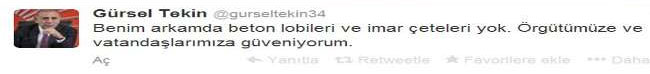 Gürsel Tekin, 'Benim arkamda beton lobileri ve imar çeteleri yok' dedi.