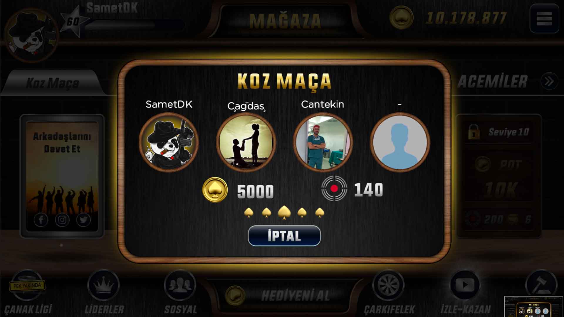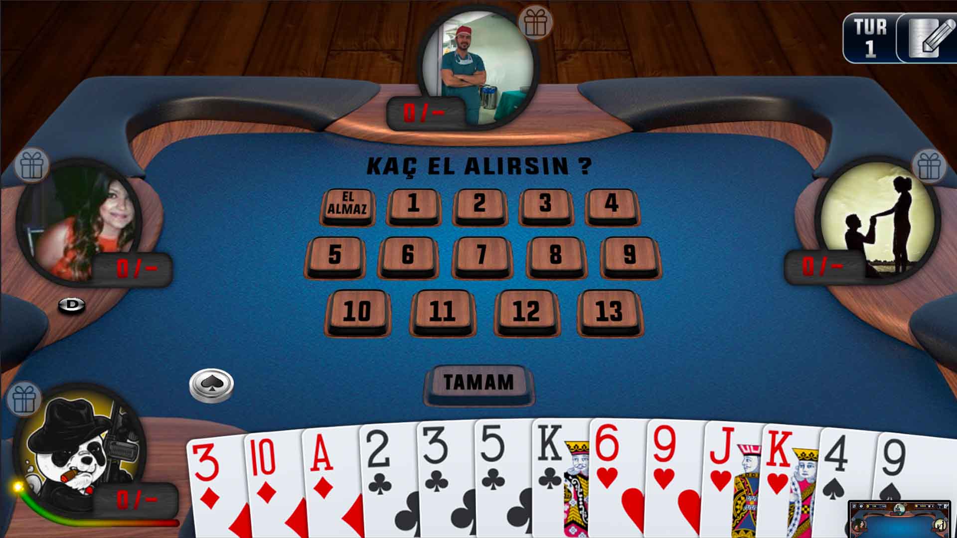 Masa başında arkadaşlarla oynanan oyun deneyimini akıllı telefon ve tabletlere taşıyan oyunu; İhale ve Koz Maça ve Eşli İhale olarak 3 farklı şekilde, giriş potu miktarına göre belirlenmiş 12 farklı odada oynayabilirsiniz. Eğer oyunu arkadaşlarınızla oynamak isterseniz,Özel Masa oluşturabilirsiniz.