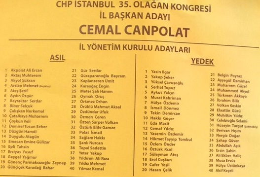 Adaylardan Cemal Canpolat 322 oy alırken, rakibi Gökan Zeybek 293 oyda kaldı. Böylece, CHP İstanbul İl Başkanlığı'na Cemal Canpolat seçilmiş oldu. Canpolat'ın listesi ise şöyle;