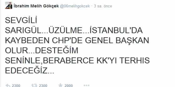 Mustafa Sarıgül'e akşam saatlerinde beklemediği bir isim twitterdan destek verdi. AK Partili Melih Gökçek, twitter üzerinden yazdığı mesajda, 'Sevgili Sarıgül, üzülme...İstanbul'da kaybeden CHP'de Genel Başkan olur, desteğim seninle, beraberce Kılıçdaroğlu'nu terhis edeceğiz...' sözlerine yer verdi.