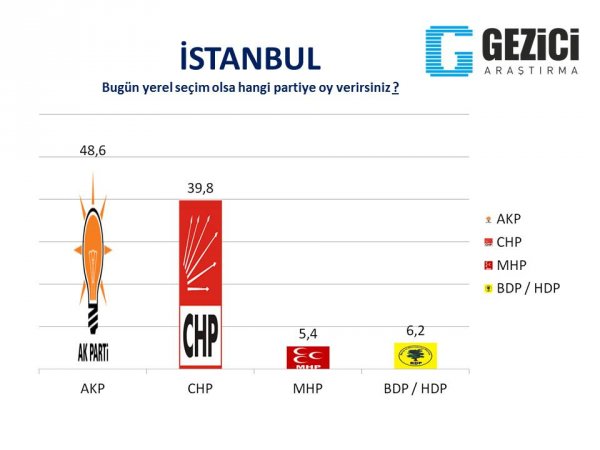 Gezici Araştırma 30 büyük şehirde, vatandaşın siyasi parti tercihlerini tespit etmek amacıyla kapsamlı anketinin sonuçlarını yayınladı. İstanbul içinse sonuçlar şöyle: