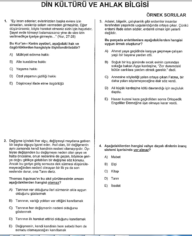 ÖSYM örnek din dersi sorularını yayınladı.