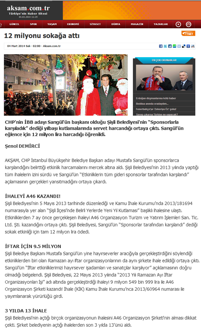 Şişli’de ki işadamlarının sponsorluğu ile gerçekleştirmesine rağmen Ramazan iftar sofraları için 2013 yılında eski parayla 9,5 trilyonluk ihale yapması ve bu ihaleyi de yine aynı firmaya vermesinin altında da yine ciddi rantın yattığını belirtmiştik.