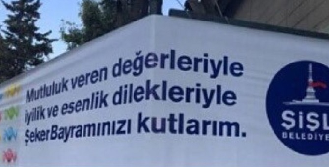 Şişli Belediye Başkanı Hayri İnönü astığı bayram ilanın da ‘Şeker Bayramınızı Kutlarım’ demiş. Bu da yetmemiş bir de ilanların yanına şeker resimleri yerleştirmiş.
